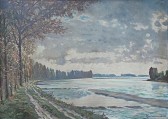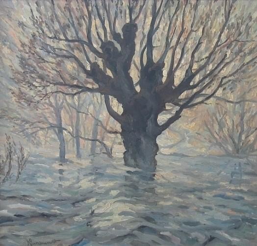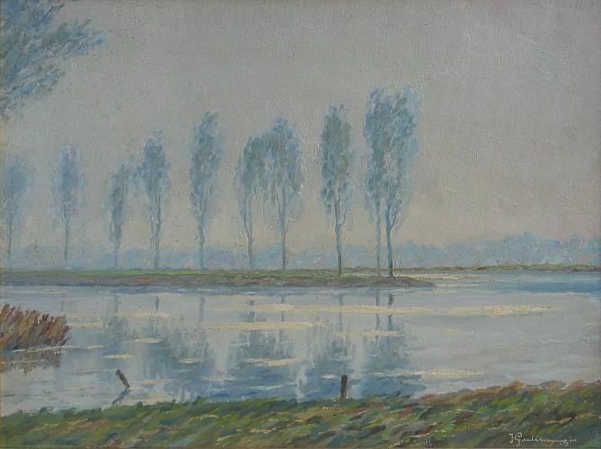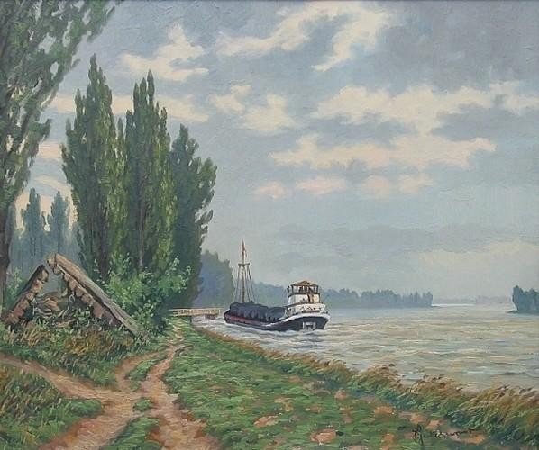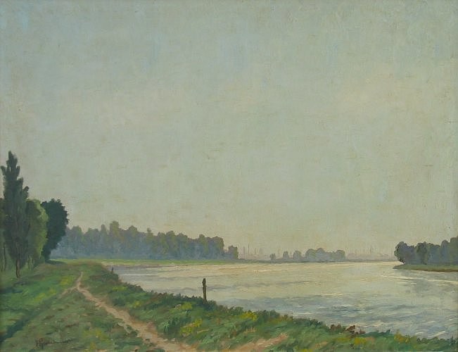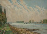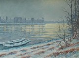 Rückseite Rheinvorland mit Boot im Morgennebel