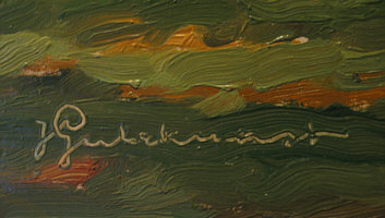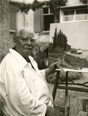 Julius Gutekunst vor seiner Staffelei im Hof des Hauses Kinzigstraße 13, wo er von seiner Rückkehr aus der Evakuierung 1950 bis zu seinem Tod im Oktober 1966 lebte. Die Signatur des Künstlers |